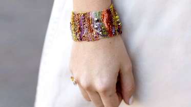 This cuff incorporates odds and ends of different yarn, fibers and beads. Liz teaches a freeform approach to looming, showing you how to set up a loom and basic weaving techniques with her “over, under, over under” mantra. You design as you go, resulting in a modern asymmetrical, textured cuff.