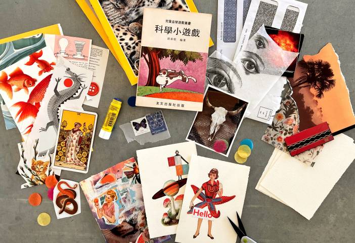 - Suggestions for collage materials: magazines, old books, plain and patterned tissue papers, postcards, washi tape, used postage stamps, maps, decorative paper scraps, stickers, food wrappers, photo copied photographs, collage image source books. etc.