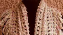 When you think if chenille you may think of robes and baby blankets but by using precut chenille strips you can make a unique openwork shawl that only looks complicated.